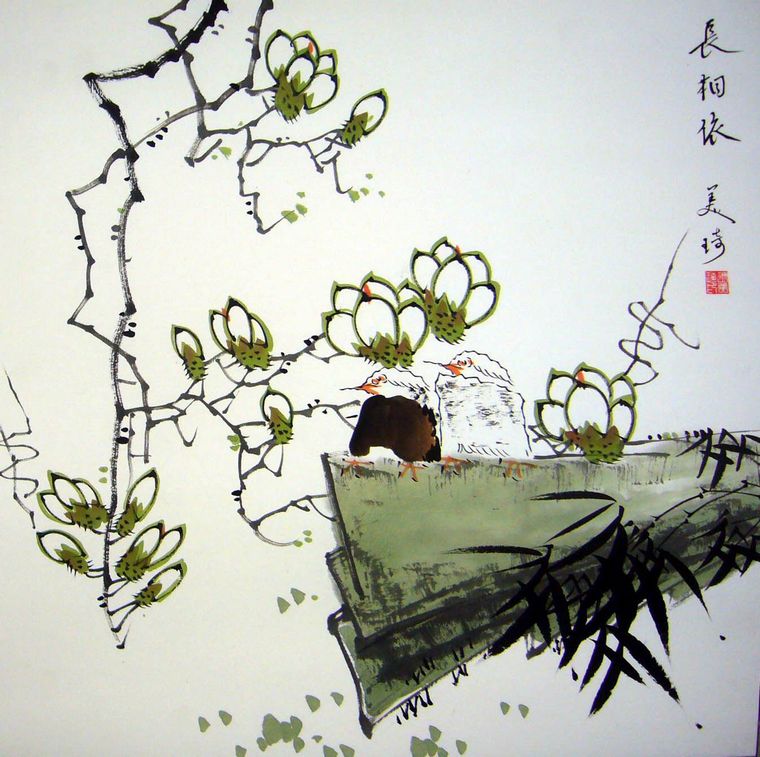 2、点采法:主要用来画鸟的羽毛,中侧锋用笔,先用一支兼毫或紫毫蘸料,一笔压一笔,披蓑形的点出自然笔触,一般点上去的料约占一个块面二分之一至二分之三,然后用一支干净采笔依照上料的顺势点采下去,使这个块面有浓淡过渡,又有片片羽毛蓬松的质感,整个过程,用笔方法是不断地点采,其笔触就是片片羽毛。此法也可用在草点,树叶的画法。