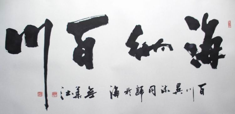 此幅作品:海纳百川,出自晋?袁宏《三国名臣序赞》:“形器不存,方寸海纳。”李周翰注:“方寸之心,如海之纳百川也,言其包含广也。” 纳:容纳,包容。大海容得下成百上千条江河之水。比喻包容的东西广泛,数量巨大。海纳百川有容乃大,就是说要豁达大度、胸怀宽阔,这也是一个人有修养的表现。人们都把那些具有像大海一样广阔胸怀的人看做是可敬的人。同时,海纳百川还有包罗万象的意思,常常用来形容事物壮阔雄奇,难以形容,于是用“海纳百川”来形容。挂在书房可自勉,挂在企业公司则不仅可以起到管理者与员工共勉的作用,又能提升企业公司的形象和品位。