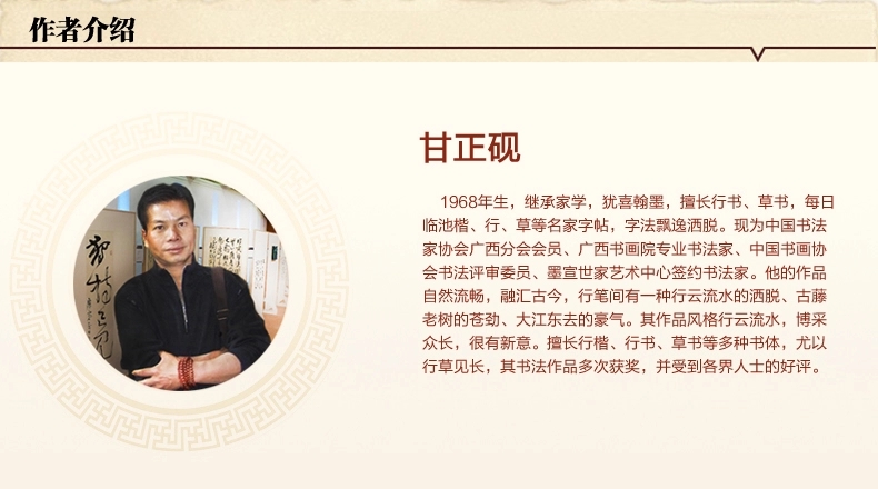 甘正砚,1968年生,继承家学,犹喜翰墨,擅长行书、草书,每日临池楷、行、草等名家字帖,字法飘逸洒脱。现为中国书法家协会广西分会会员、广西书画院专业书法家、中国书画协会书法评审委员,他的作品自然流畅,融汇古今,行笔间有一种行云流水的洒脱、古藤老树的苍劲、大江东去的豪气。其作品风格行云流水,博采众长,很有新意。擅长行楷、行书、草书等多种书体,尤以行草见长,其书法作品多次获奖,并受到各界人士的好评。