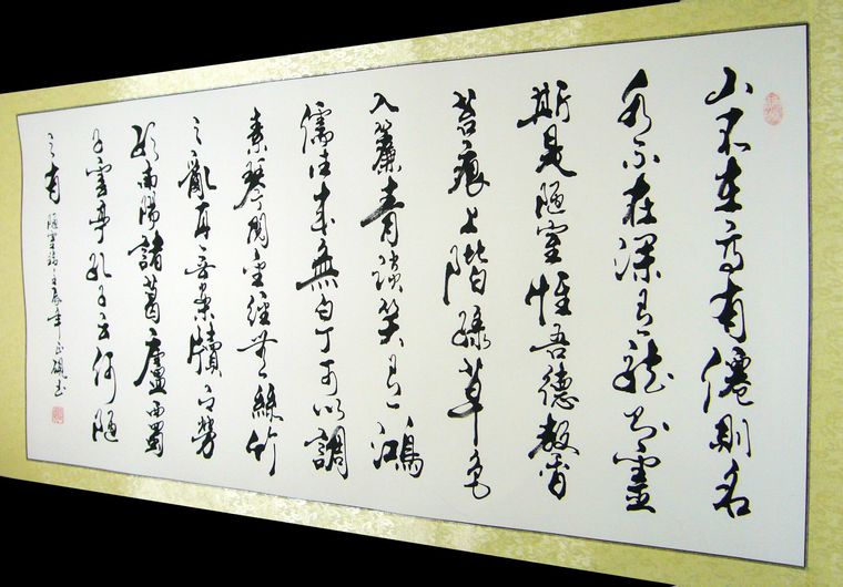 甘正砚四尺横幅作品笔力灵秀俊美。可以选择挂在家里的书房,客厅,用以体现居家主任的品位与修养,也可以挂在公司办公室,彰显领导的内涵。广西书法家甘正砚老师此幅书法的价格在1600左右。
