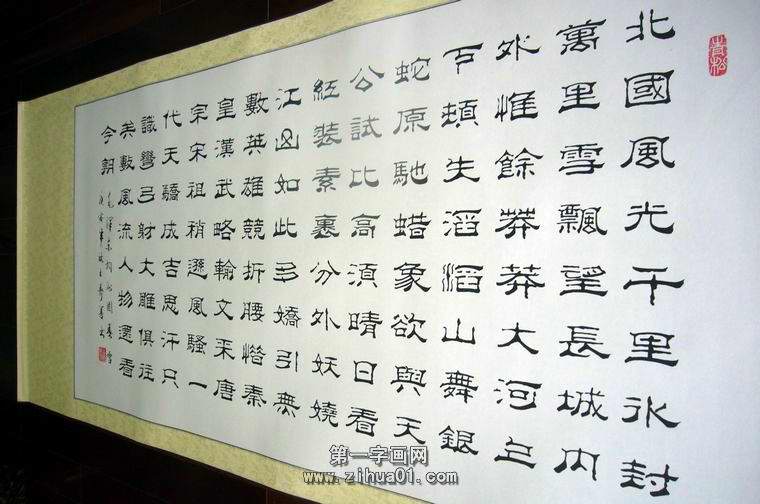 第一字画网的四尺隶书沁园春雪,是用隶书完成的毛主席的经典诗词,这幅四尺隶书沁园春雪装裱后长度达到1.8米左右,作品笔法老练,苍劲有力,如果放在画廊出售,山东书协寿善老师此副隶书沁园春雪装裱后的标价起码在1600元左右。
