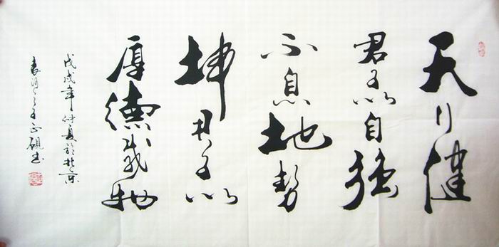 第一字画网新到的四尺书法作品,内容为:天行健、君子以自强不息;地势坤、君子以厚德载物,是幅适合领导办公室挂的书法,甘正砚老师这幅作品装裱后尺寸达1.8米,笔法老练,如果放在画廊出售,广西书法家甘正砚老师此幅作品的标价在1000元左右。