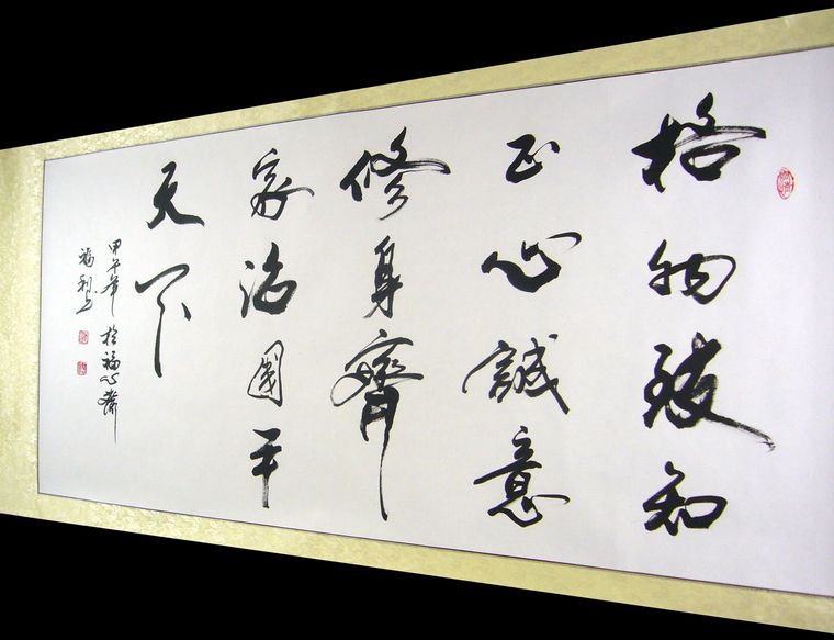 第一字画网的四尺书法作品,内容为:格物、致知、正心、诚意、修身、齐家、治国、平天下,是幅挂在领导办公室适合的书法,挂在领导的办公室很有一种意境。这幅书法是山东书法家协会福利老师的书法作品,装裱后长度约在1.8米左右,作品笔法老练,如果放在画廊出售,福利老师此副书法裱完后的标价大约在1000元左右。