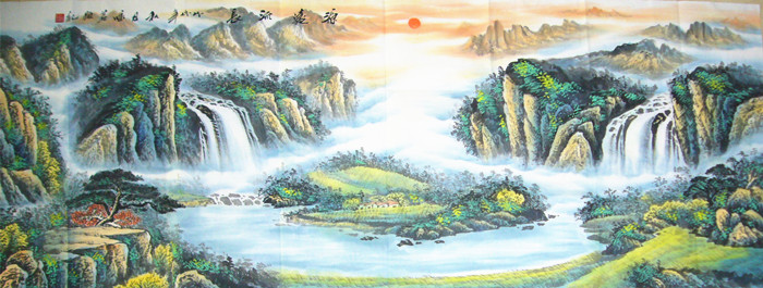 第一字画网的山水画作品,适合作为会议室背景山水画,也可以挂在家里的客厅等场合,是一幅咏茗老师的实力新作,作品画功精湛,画面的布局也是一流的,后方的红日寓意着旭日东升,大瀑布代表着源远流长,作品意境深动,视觉效果上佳,如果放在画廊出售,咏茗老师此幅山水画的标价在3=600元左右。