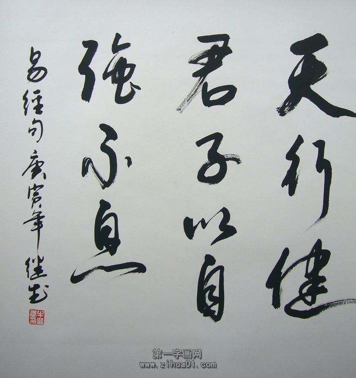 第一字画网的书房客厅书法词,内容为:天行健、君子以自强不息,是幅适合挂在客厅书房的书法作品,也可以挂公司的办公室。这幅书法是山东书法名家继武老师的书法作品,装裱后长度约在1.65米左右,也可以作为见方的裱片来用,作品笔法老练,如果放在画廊出售,继武老师此副书房客厅书法词裱完后的标价大约在1000元左右。