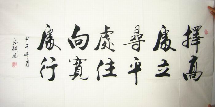 第一字画网的四尺企业办公室字画 ,内容“择高处立,寻平处住,向宽处行”,适合作为送领导书法内容,可以挂在领导或老总的办公室,也可以挂在家里的书房。这幅书法是广西书法家协会甘正砚老师的书法作品,装裱后长度约在1.8米左右,作品笔法老练,如果放在画廊出售,甘正砚老师此幅书法的标价大约在1500元左右。