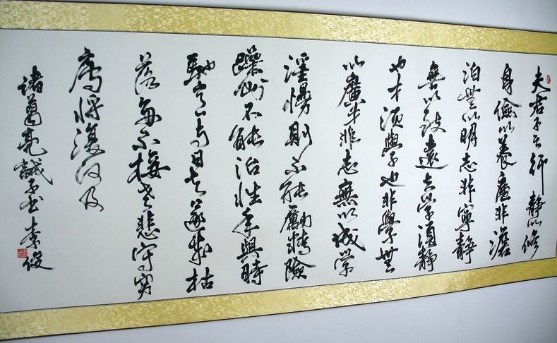 第一字画网的六尺书法诫子书,适合挂在家里的客厅,或是公司的办公室,气派非凡。这幅六尺书法诫子书是湖南书法家协会李俊老师的作品,装裱后长度约在2.2米左右,作品笔法老练苍劲大气,如果放在画廊出售,李俊老师此副六尺书法诫子书裱完后的标价远大于网上价格。