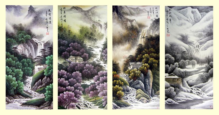 【尺寸】:三尺春夏秋冬山水画四条屏