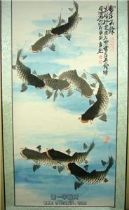 第一字画网的工笔画九鱼图,已装裱成卷轴,可以直接悬挂。工笔画九鱼图作品裱完后尺寸近1.8米左右,是一副非常清新的荷花九鱼作品,作品画风细腻、栩栩如生,九鱼图寓意着长长久久,吉祥如意,挂在家里客厅或是送人都是非常不错的选择,如果放在画廊出售,画家韩梅老师此幅工笔画九鱼图的标价在2500元左右。“鱼”与“余”谐音,鱼则象征着富贵,所以中国吉祥图案中常有鱼的图案。九鱼图中,“九”取长长久久之意,“鱼”取其万事如意,寓意年年有余,富贵有余。