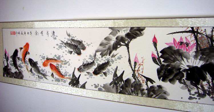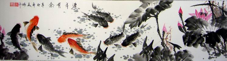• 产品简介: 餐厅九鱼图,王美琦老师六尺对开九鱼图佳作,已装裱。