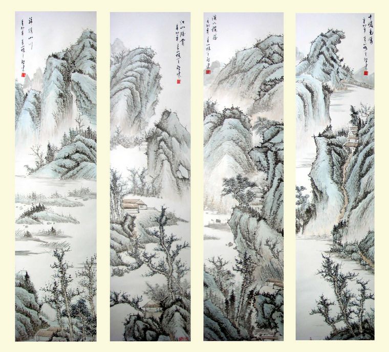 • 产品简介: 四条屏山水画,刘智东老师四尺对开山水佳作,已装裱成卷轴,共四幅组成。