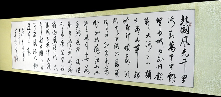 第一字画的八尺书法沁园春雪,是幅适合挂在办公室或客厅的书法作品,大气磅礴。这幅书法是山东济南书法家协会俊林老师的书法作品,装裱后长度约在2.8米左右,已完成装裱。作品笔法老练,如果放在画廊出售,青年书法家彩墨轩主俊林老师此幅小八尺书法沁园春雪的标价大约在1800元左右。