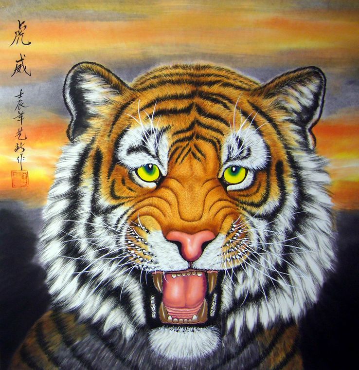 第一字画网的虎威图,已完成装裱,作品画法精妙,栩栩如生,是水准上佳的老虎作品,挂虎画能起到镇宅的作用,气势十足,如果放在画廊出售,汪艺新老师此幅虎威图裱完后的标价在1500元左右。