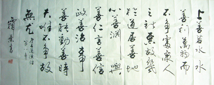 第一字画网的行书法书法道德经第八章,这幅小六尺的道德经上善若水书法非常适合挂在客厅或办公室,装裱后尺寸近2.2米长,从这幅诫子书书法中看出作品笔法老练,功力深厚。李正枢老师,字霜叶,1942年生,云南的老书法家,擅长行楷,几十年的书法功底,功力深厚。李老师已经是兰亭杯书法大赛特邀参展嘉宾,他四尺对开的书法在云南的艺术品拍卖行已经是2000元起拍价了,光看字的水准就知道了,这幅小六尺的书法道德经书法市场价格在7000元朝上了。