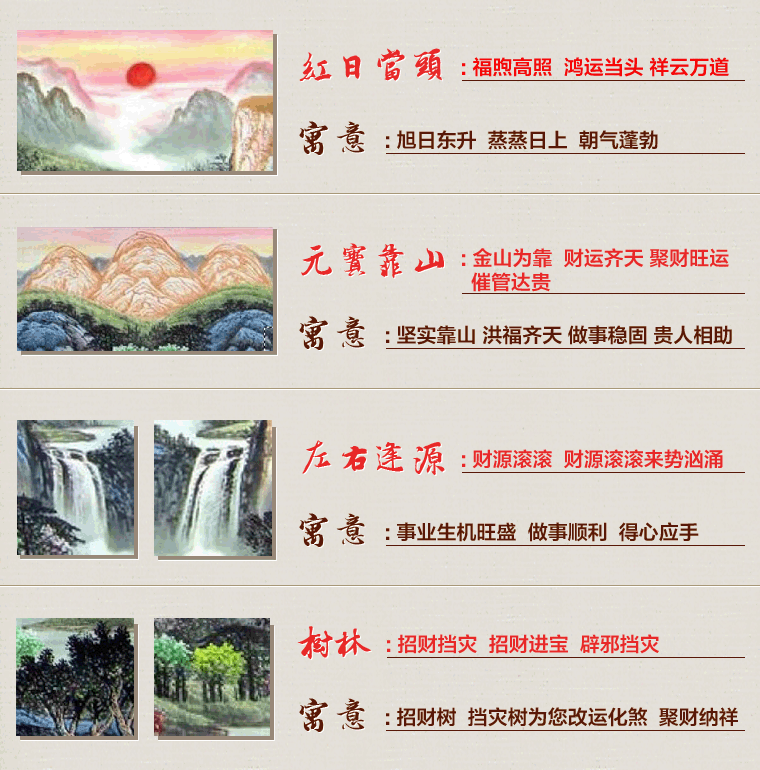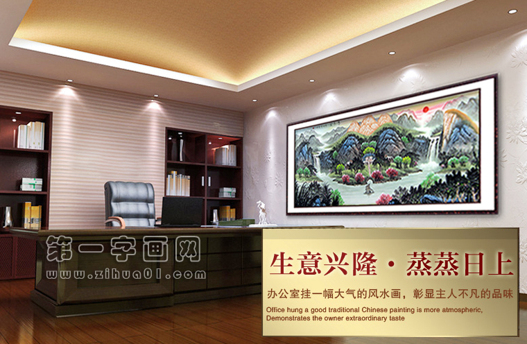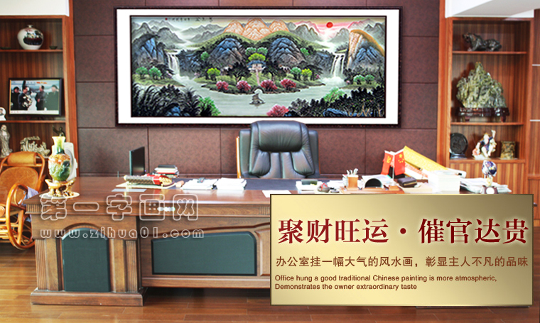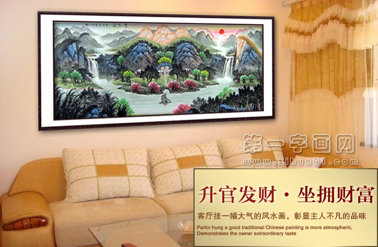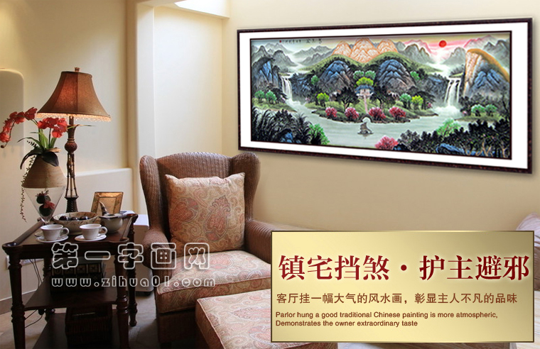 聚宝盆:此画是第一字画网推荐的风水画佳作。刘淋老师整幅作品根据风水布局、满含鸿运当头,财运如浩浩瀑水,生生不息之意。作品整体看来象个金元宝。远山层峦叠峰,更表达了源远流长的意境。因此挂山水画是非常吉利的。将此风水画悬挂于厅堂,立添主人财气,令人一见即生舒适安逸之感,获人兴财旺之效。青山绿松间配上了瀑布流水,不仅给画面增添了灵韵和动感,更表现了一种财源滚滚,源远流长的吉祥意义。非常适合家居,企业正堂装挂及馈赠亲朋好友的上佳之选~!!!