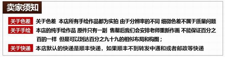 第一字画网承诺:本站除百寿百福图以外,所有的字画作品,100%都是真人的全手绘作品(百寿百福为金粉绘制或篆刻作品),绝不会用印刷画、高仿画来滥竽充数,第一字画网用永远的信誉作担保,我们只售全手绘的字画作品!包括满500元特价换购区内几十元的作品,也都是真人全手绘画出来的作品,请广大新老客户放心选购。