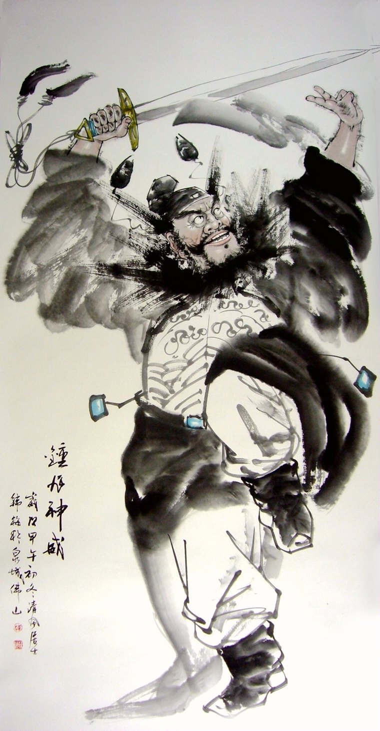 • 产品简介: 钟馗图,适合挂在家里镇宅辟邪,韩梅老师人物画作品,四尺竖幅,已装裱成轴。