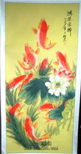 • 产品简介: 工笔画荷花鱼,画家韩梅四尺佳作,已装裱。