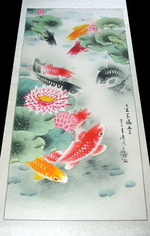 第一字画网餐厅风水九鱼画,这幅三尺的工笔画九鱼荷花装裱后长1.5米左右,是一幅非常有灵气的作品,九鱼图寓意长长久久、连年有余,作品挂在家里餐厅或客厅都是不错的选择,作品的画功十分细腻,水准出色,如果放在画廊出售,韩梅老师此幅三尺国画九鱼图的标价在2000元左右。
