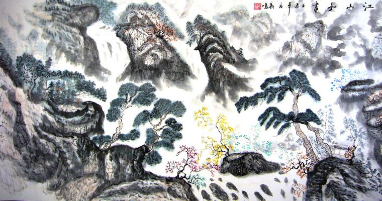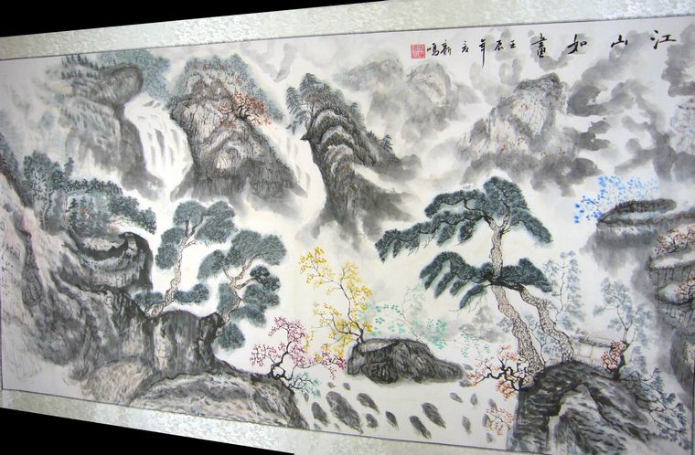 第一字画网水墨山水画,是幅挂在家里的客厅,或是公司的大型会议室。六尺山水画裱完后长度达2.2米左右,是一副大气磅礴的山水作品,作品意境生动、山水交汇,是副风水极佳的山水大作。如果放在画廊出售,新鸣老师此幅六尺横幅山水画的标价在2500元左右。作品功力深厚,构图气势磅礴,风水布局效果极佳.