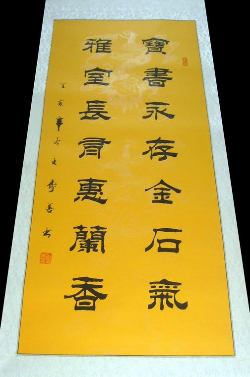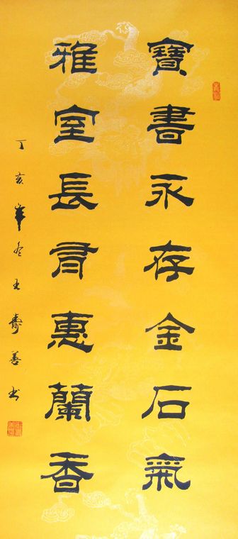 第一字画网的对联书法作品,这幅书法是山东书法家协会寿善老师的隶书作品,装裱后长度约在1.83米左右,作品笔法老练,如果放在画廊出售,寿善老师此幅四尺隶书上善若水的标价大约在1400元左右。