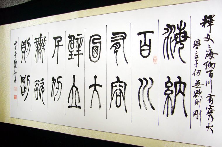 第一字画网篆书办公室书法,适合挂在公司的会客室,或是家里的客厅,这幅四尺书法是书法名家张纯启老师的篆书作品,装裱后长度约在1.8米左右,这幅篆书作品笔法老练,如果放在画廊出售,张纯启老师此幅名家篆书的标价大约在8000元左右。