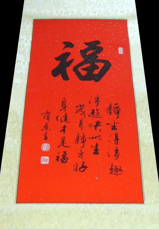 第一字画福的书法,这幅书法作品水准出色,适合挂家里书房客厅、或用作送长辈,如果放在画廊出售,李正枢老师此幅福的书法的标价大约在1200元左右。小字内容为:静坐得清趣,清游快此生,岁月静方好,身健才是福。李正枢老师,字霜叶,云南的老书法家,擅长行楷,几十年的书法功力,功力深厚。李老师四尺对开的书法在云南的艺术品拍卖行已经是2000元起拍价了,书法的实力不用细说,光看字的水准就知道了。
