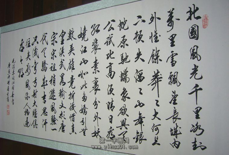 第一字画网的四尺书法沁园春雪,数量仅一幅,售完即止。这幅书法沁园春雪非常适合挂在书房或客厅,也可以挂在公司的办公室,装裱后尺寸达到1.7米长,作品笔法老练,苍劲有力,如果放在画廊出售,广东书协谢籣生老师此副书法作品装裱后的标价在1000元左右。《沁园春雪》是毛泽东主席的名篇,分上下两片。上片描写北国雪景,展现祖国山河的壮丽;下片由祖国山河的壮丽而感叹,并引出英雄人物,纵论历代英雄人物,抒发诗人伟大的抱负。