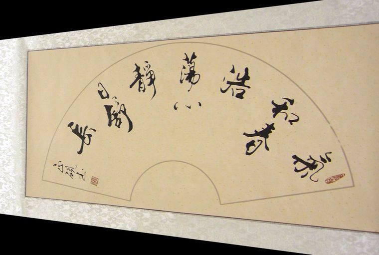 第一字画网的扇形诗句书法,适合挂在公司的办公室等场合,这幅扇形诗句书法装裱后长度约在1.26米左右,作品清秀洒脱,如果放在画廊出售,甘正砚老师此幅扇形诗句书法的标价大约在800元左右。