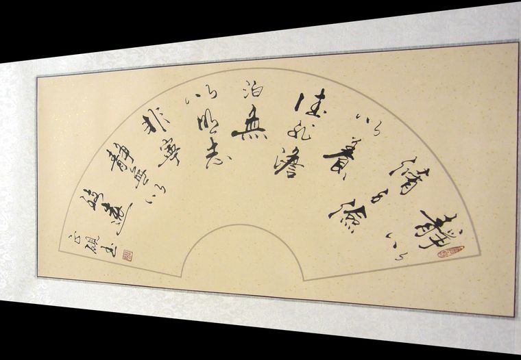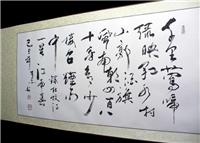 第一字画网的扇形名句书法,适合挂在公司的办公室等场合,这幅扇形名句书法装裱后长度约在1.26米左右,作品清秀洒脱,如果放在画廊出售,甘正砚老师此幅扇形名句书法的标价大约在800元左右。