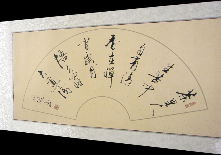 第一字画网的扇形茶道书法,适合挂在书法、茶室或会客室等场合,这幅扇形茶道书法装裱后长度约在1.26米左右,作品清秀洒脱,如果放在画廊出售,甘正砚老师此幅扇形茶道书法的标价大约在800元左右。