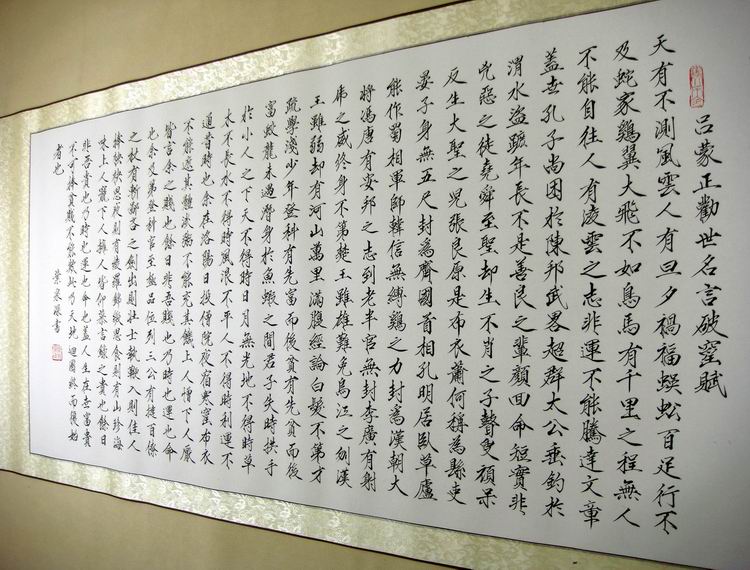 第一字画网的四尺书法劝世名言,已完成装裱。这幅书法作品吕蒙正劝世名言破窑赋裱后尺寸达到1.8米长,从这幅书法劝世名言中看出作品笔法老练,清新秀丽,如果放在画廊出售,广西书协泉深老师此副书法劝世名言装裱后的标价在1800元左右。