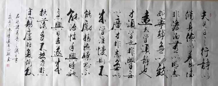 《诫子书》成为后世历代学子修身立志的名篇。它可以看作是诸葛亮对其一生的总结,作品笔法洒脱,布局老练,如果放在画廊出售,广西书法家甘正砚老师此幅八尺名句书法的标价大约在3000元左右。