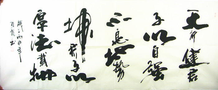 第一字画网的小六尺诗句励志书法——天行健、君子以自强不息;地势坤、君子以厚德载物,适合挂在公司的办公室,或是家里的客厅,这幅小六尺书法是湖北书法家协会桂龙老师的作品,装裱后长度约在2.2米左右,作品笔法老练苍劲大气,如果放在画廊出售,桂龙老师此幅小六尺名句书法的标价大约在1800元左右。