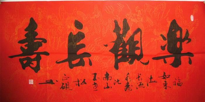 第一字画网的贺寿书法乐观长寿,适合用作老人生日场合的祝寿贺寿,这幅四尺贺寿书法乐观长寿书法祝寿贺词福寿康宁的内容特别适合用作老人祝寿贺词,用作给长辈的祝寿场合是非常赞的祝寿语,这幅书法是广西书法家甘正砚老师的作品,用的是四尺宣纸,装裱后长度约在1.8米左右,如果放在画廊出售,甘正砚老师这幅老人祝寿贺词的价格大约在1500元左右。