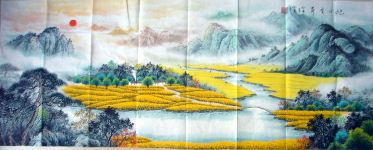 第一字画网的山水画作品,适合作为客厅背景山水画,也可以挂在家里的客厅等场合,是一幅咏茗老师的实力新作,作品画功精湛,画面的布局也是一流的,后方的红日寓意着旭日东升,金黄色的麦田是丰收的象征,寓意财源滚滚,黄金满屋。作品意境深动,视觉效果上佳,如果放在画廊出售,咏茗老师此幅山水画的标价在3000元左右。