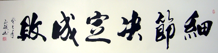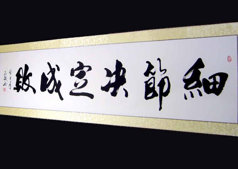 第一字画网的六尺对开书法作品,这幅书法作品非常适合挂在公司的办公室,或是家里的客厅。作品装裱后长度达2.2米左右,如果放在画廊出售,甘正砚老师此幅细节决定成败六尺对开书法作品的标价起码在1200元左右。