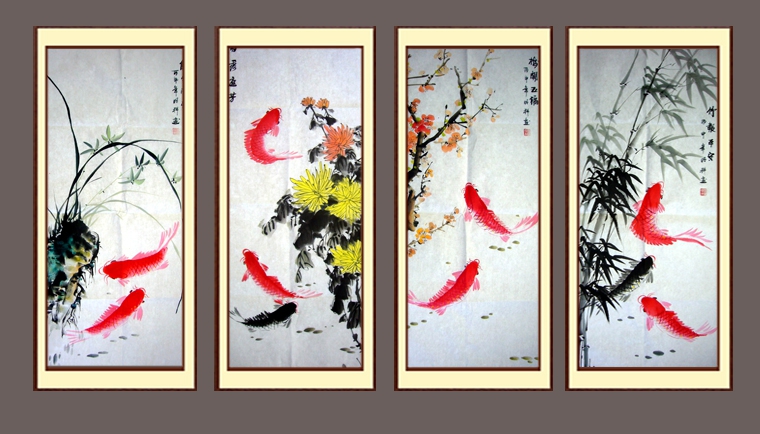 第一字画网的连年有余四条屏,配合梅兰竹菊的背景,相得益彰,非常雅致。是套适合挂在书房或客厅的写意作品,如果放在画廊出售,广西美协明科老师此套连年有余四条屏的标价大约在2000元左右。