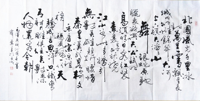 第一字画网的四尺书法佳作沁园春雪,这幅毛主席的沁园春雪书法非常适合挂在客厅或办公室,装裱后尺寸近1.8米长,从这幅沁园春雪书法欣赏中看出笔法老练,苍劲有力,如果放在画廊出售,云南老书法家李正枢老师此幅沁园春雪书法的标价在5000元左右。