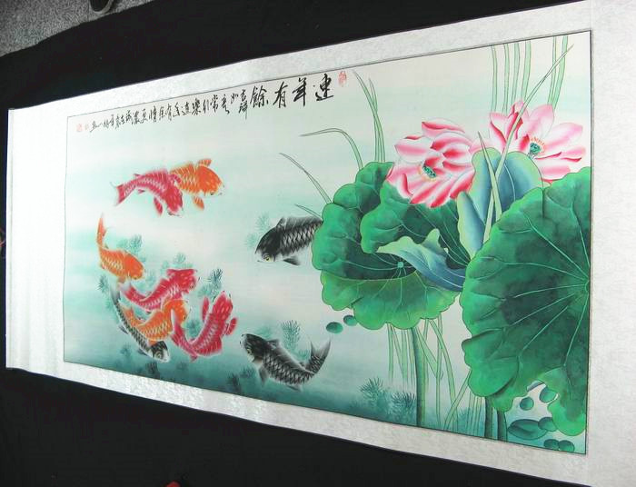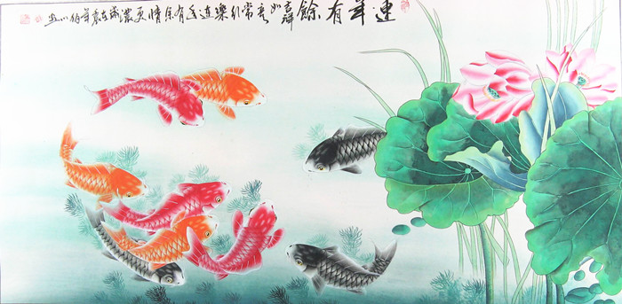 第一字画网的四尺横幅九鱼图,这幅四尺的荷花九鱼图作品裱完后长度近1.8米左右,是一幅水准上佳的作品,作品画风细腻、栩栩如生,荷花出淤泥而不染,濯清涟而不妖,寓意纯洁、洁白。鲤鱼象征富贵,有余而富足,二者结合招财纳福、趋吉避凶。挂在家里客厅或是送人都是非常不错的选择,如果放在画廊出售,谭佰川老师此幅四尺荷花鲤鱼图的标价在1500元左右。