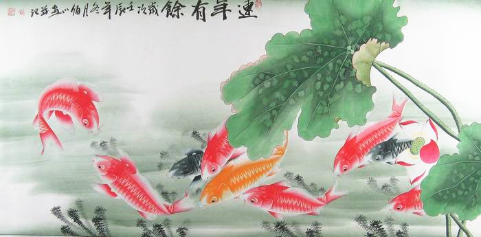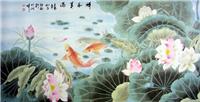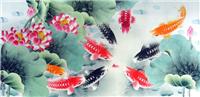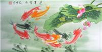 • 产品简介: 客厅荷花鲤鱼图,谭佰川老师四尺荷花九鱼图作品