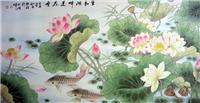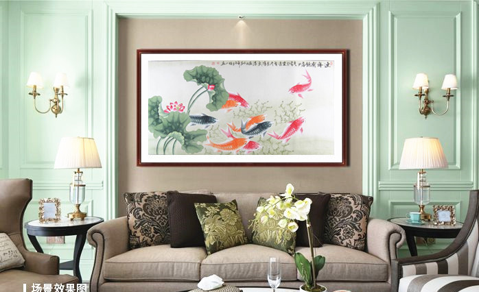 第一字画网的国画鱼工笔鱼,这幅四尺的荷花鱼图画九鱼图作品裱完后长度近1.8米左右,是一幅水准上佳的作品,作品画风细腻、栩栩如生,荷花出淤泥而不染,濯清涟而不妖,寓意纯洁、洁白。鲤鱼象征富贵,有余而富足,二者结合招财纳福、趋吉避凶。挂在家里客厅或是送人都是非常不错的选择,如果放在画廊出售,谭佰川老师此幅连年有余九鱼图、国画鱼,鱼国画,工笔鱼的标价在1500元左右。
