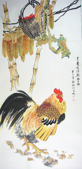 • 产品简介: 写意国画雄鸡图,齐鲁画家韩梅四尺竖幅工笔画佳作,已装裱成卷轴,可以直接悬挂。