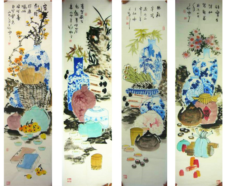 国画四条屏花鸟画