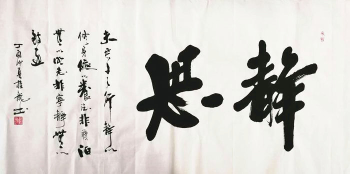 第一字画网的办公室四尺行书,适合挂在家里的客厅或是书房,这幅法作品静思是湖北书法家郁桂龙老师的作品,装裱后长度约在1.8米左右,作品笔法老练,如果放在画廊出售,桂龙老师此幅毛笔书法办公室行书法静思的标价大约在1500元左右。