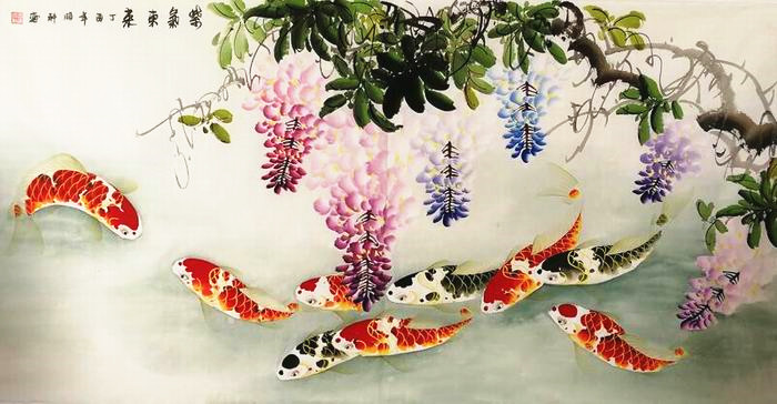 第一字画网的四尺横幅九鱼图《紫气东来》,数量仅一幅,是幅适合客厅或居室挂的国画荷花鲤鱼图,是一幅性价比很高的全手绘鲤鱼荷花图,如果放在画廊出售,广西画家明科老师此幅国画写意九鱼图的标价大约在2600元左右。