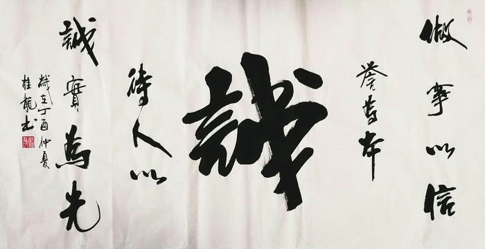 第一字画网的办公室字画诚字书法,适合挂在家里的客厅或是书房,这幅法作品诚字是湖北书法家郁桂龙老师的作品,装裱后长度约在1.8米左右,作品笔法老练,如果放在画廊出售,桂龙老师此幅毛笔书法诚字书法的标价大约在1500元左右。