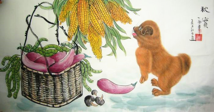 第一字画网的国画动物画,这幅三尺写意国画动物画裱完后尺寸近0.8米,是一幅水准上佳的作品,作品画风细腻、栩栩如生,玉米、茄子等农作物代表秋天的收获,小狗又叫旺财,两者结合起来寓意丰衣足食、富贵吉祥。挂在家里客厅、玄关或是送人都是非常不错的选择,如果放在画廊出售,沈弘文老师此幅写意国画动物画的标价在2000元左右。此幅优秀画动物画秋实作品,仅售780元,从作品的画面的细节处可以看出弘文老师的画功十分了得,适合挂在家里的客厅,喜气吉祥、富贵满堂。