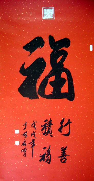 释永增大师对书法艺术的追求,释永增历来是虔诚而执着的,不求功利,对每幅书法的创作也是认真而严谨的,尽量完美,他十分重视作品的整体神韵和章法的随意成妙,他的行草书格调高雅、自然洒脱、点划精到;行书笔力遒劲、气韵畅达、意趣横生。如果放在画廊出售,释永增大师此幅四尺名家书法福字的标价大约在25000元左右。
