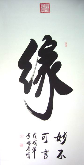 释永增大师对书法艺术的追求,释永增历来是虔诚而执着的,不求功利,对每幅书法的创作也是认真而严谨的,尽量完美,他十分重视作品的整体神韵和章法的随意成妙,他的行草书格调高雅、自然洒脱、点划精到;行书笔力遒劲、气韵畅达、意趣横生。如果放在画廊出售,释永增大师此幅四尺名家书法缘的标价大约在25000元左右。